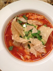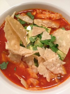 To serve, place a small handful of tortilla strips at the bottom of a soup bowl.  Ladle in soup and top with sour cream, cilantro, avocado and more tortilla strips.