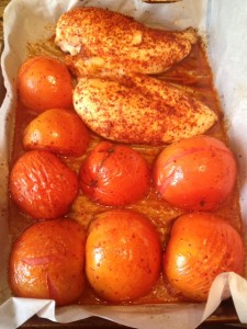 Combine first four ingredients in a small bowl and mix well.  Place chicken and tomatoes skin-side down on a parchment paper lined sheet pan.  Drizzle oil over tomatoes and chicken, making sure to coat all sides.  Rub tomatoes and chicken with spice mixture.
